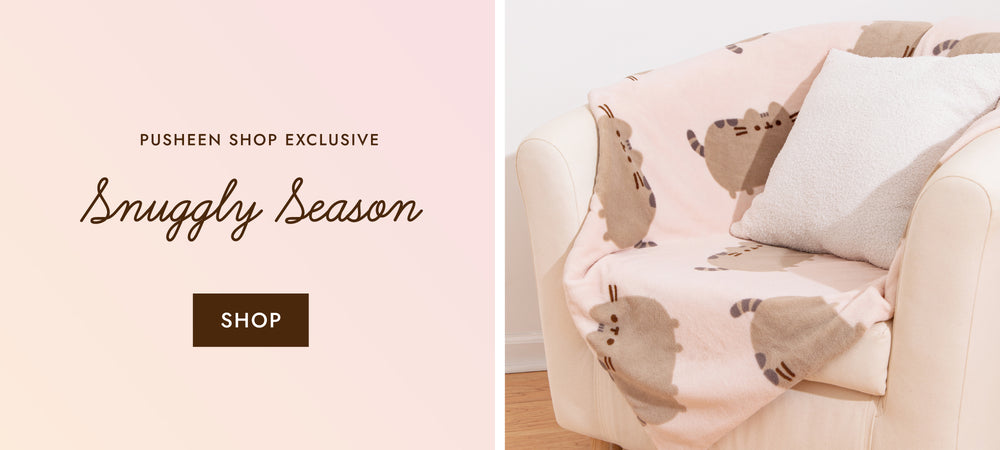 Pusheen Blanket draped over a cream arm chair with a pillow on top.
