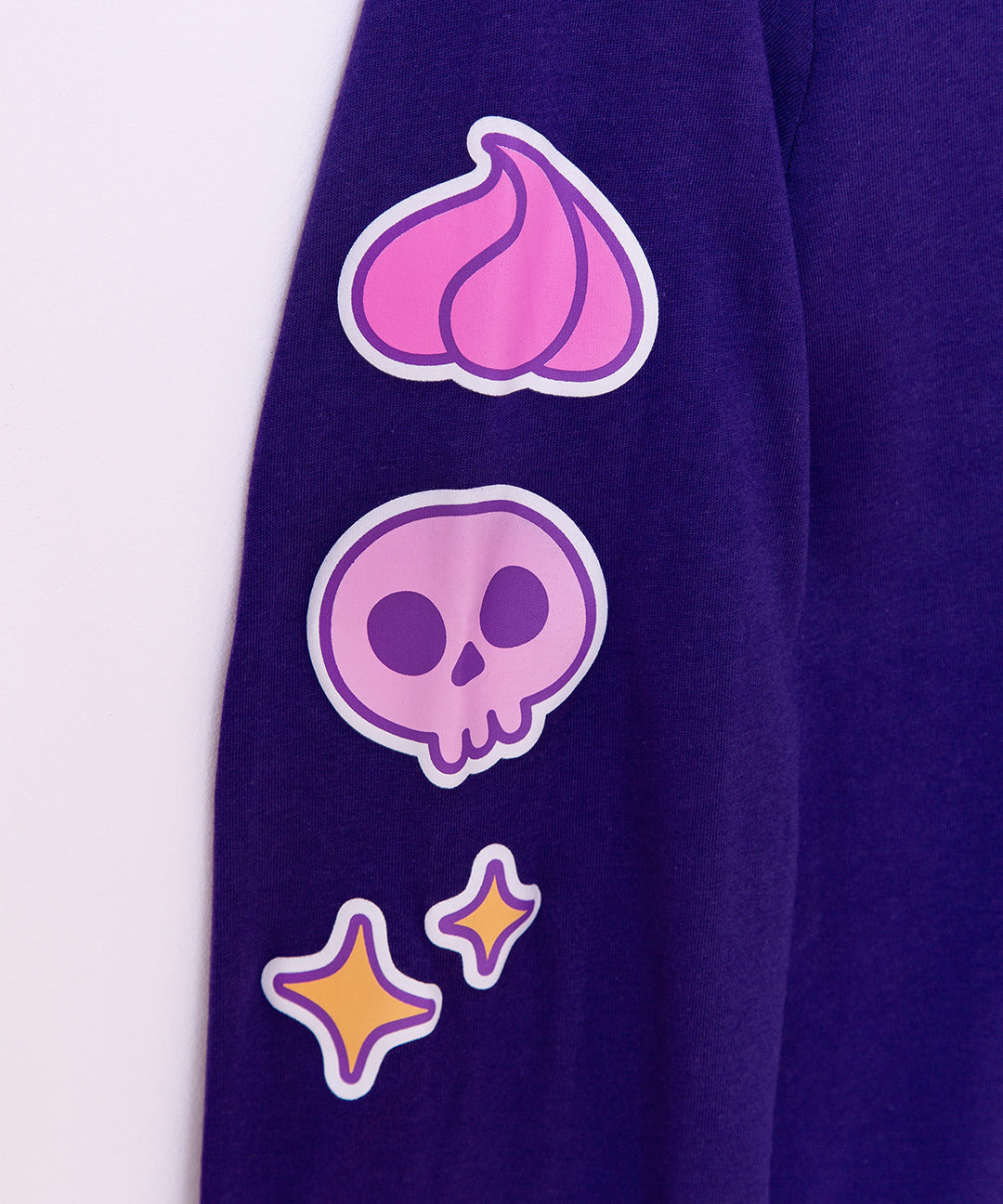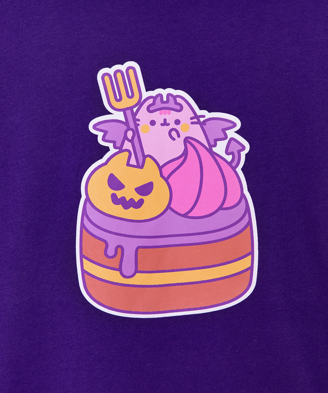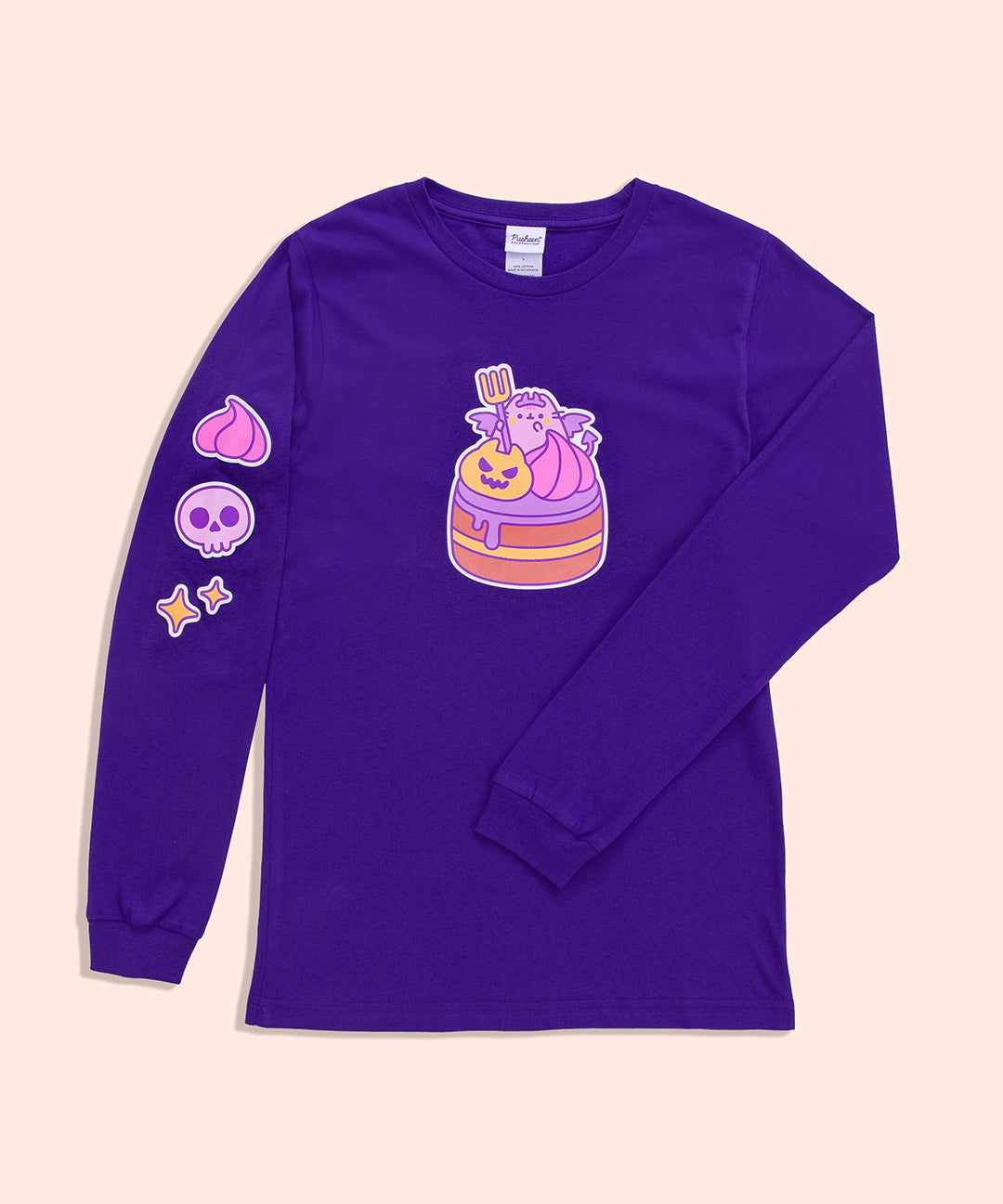 A devilishly delightful cggcw Exclusive! The Devil's Food Cake Pusheen Long-Sleeve Unisex Tee has a large graphic in the center of the purple tee featuring Pusheen sitting atop a devil's food cake. Down the right sleeve are three icons including a whipped cream dollop, a skull, and sparkles.