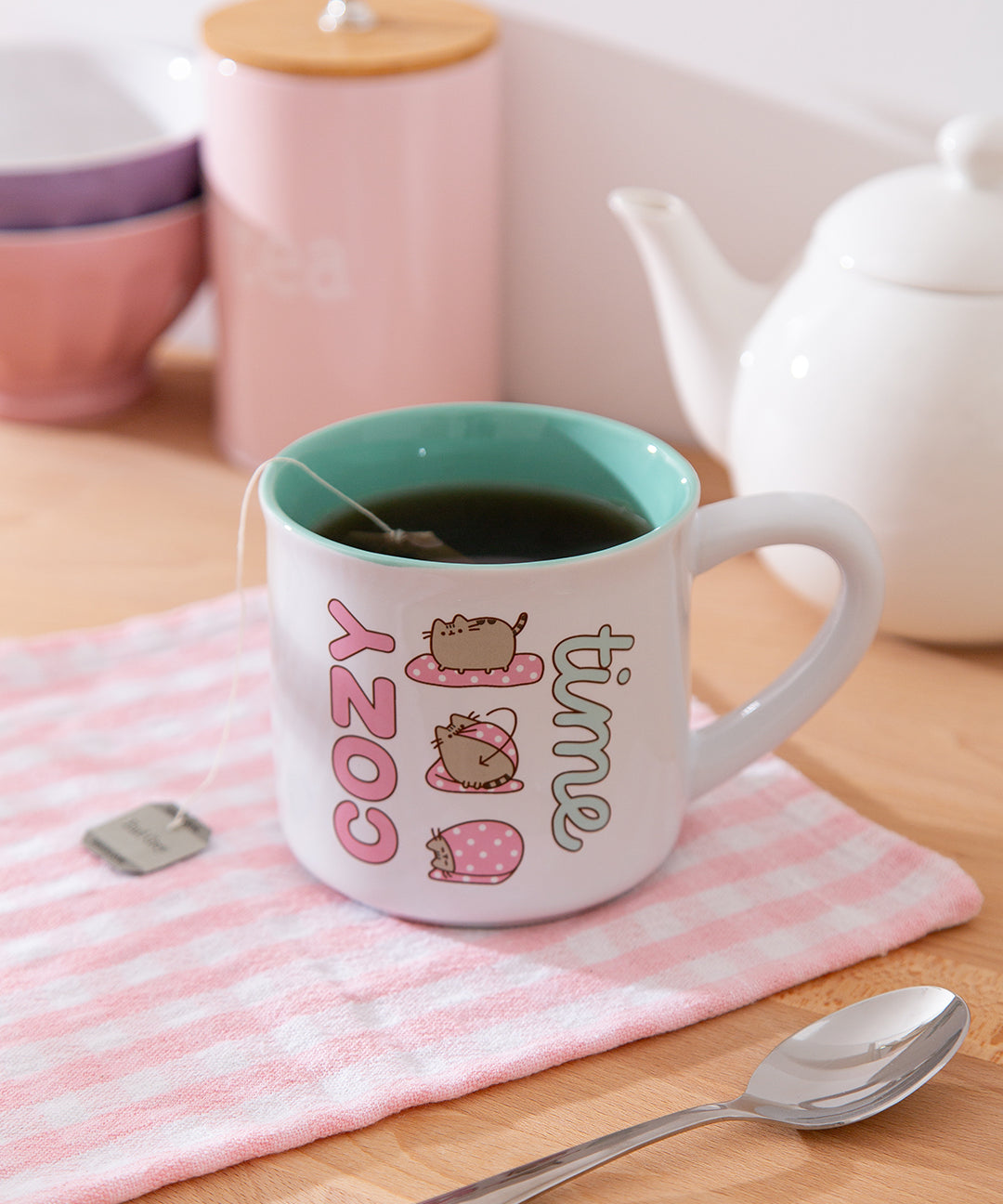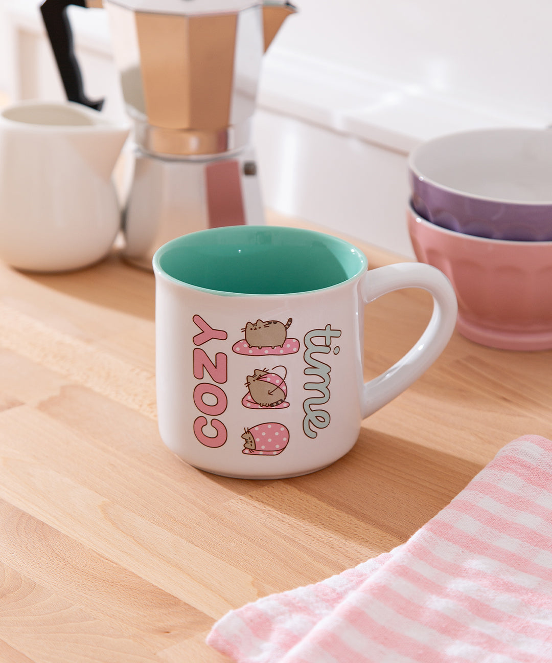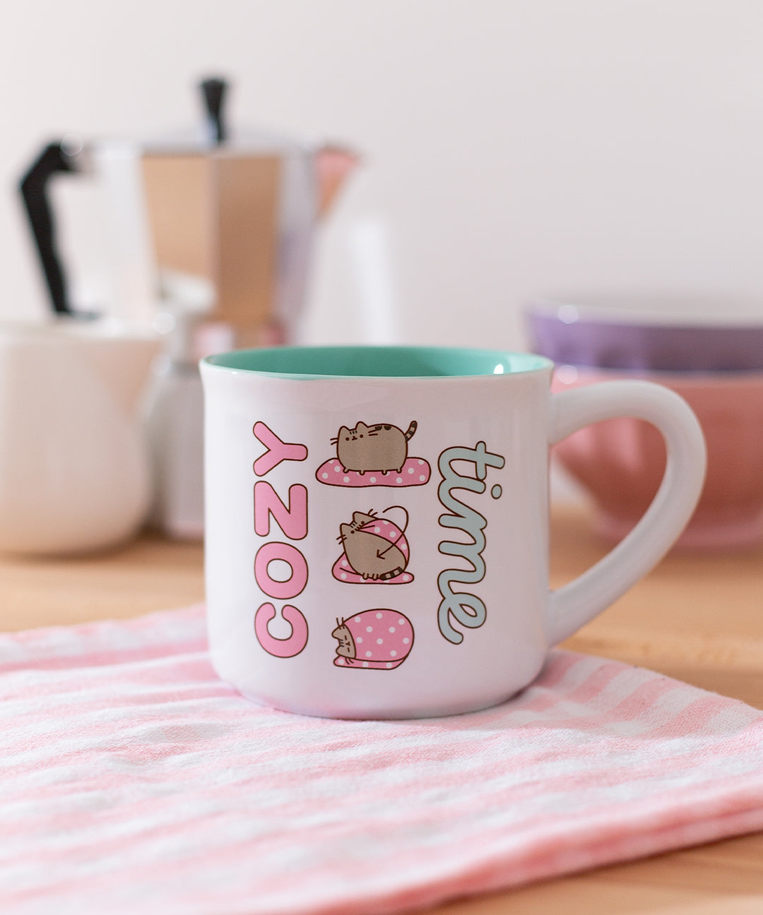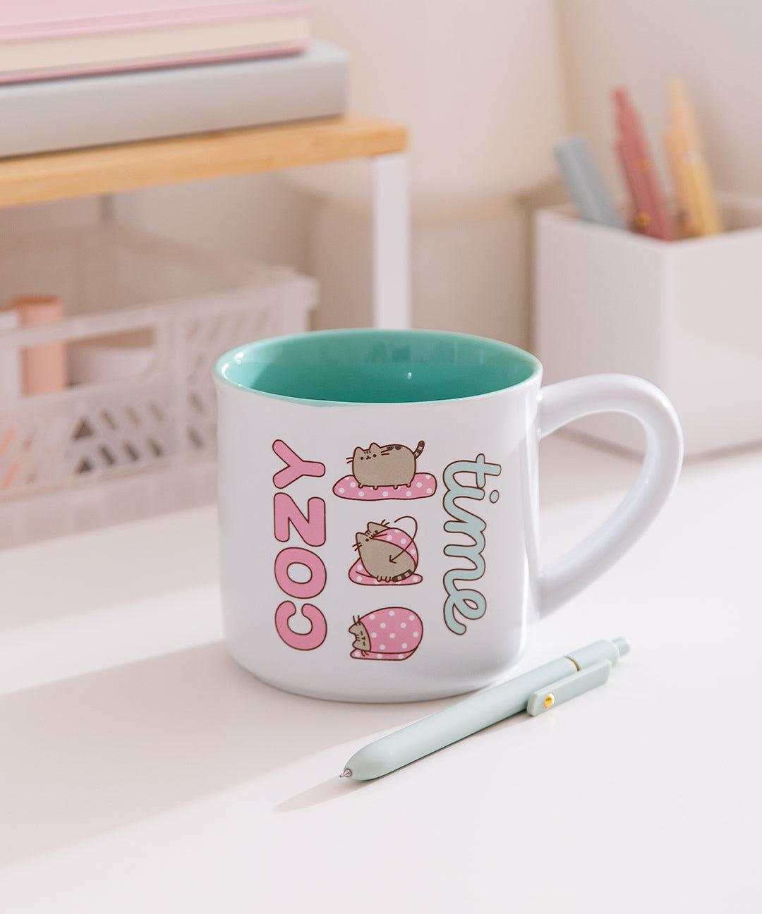• White mug features Pusheen snuggling into a blanket with the phrase "cozy time".