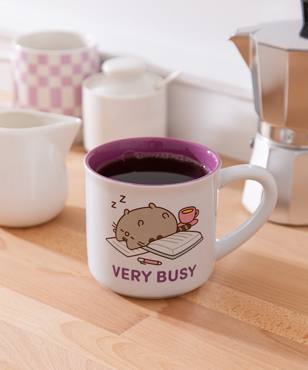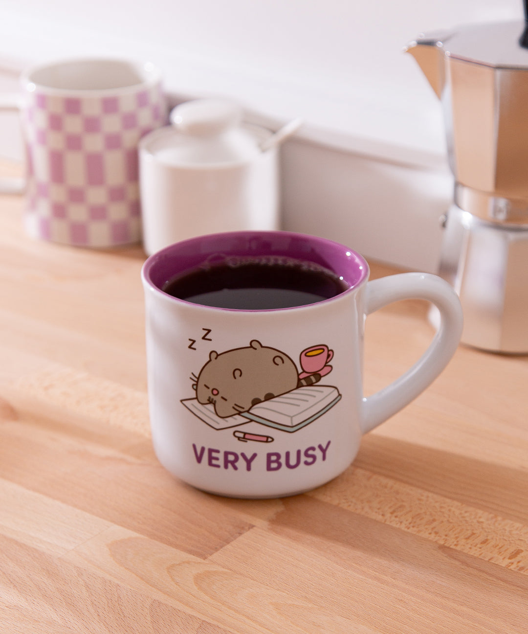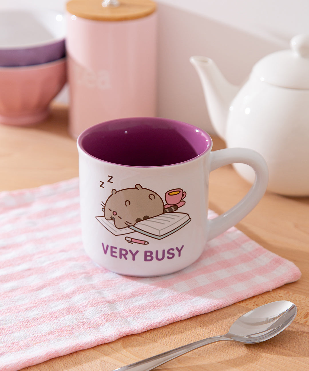 - White mug features Pusheen snoozing on her notebook with the phrase "very busy".