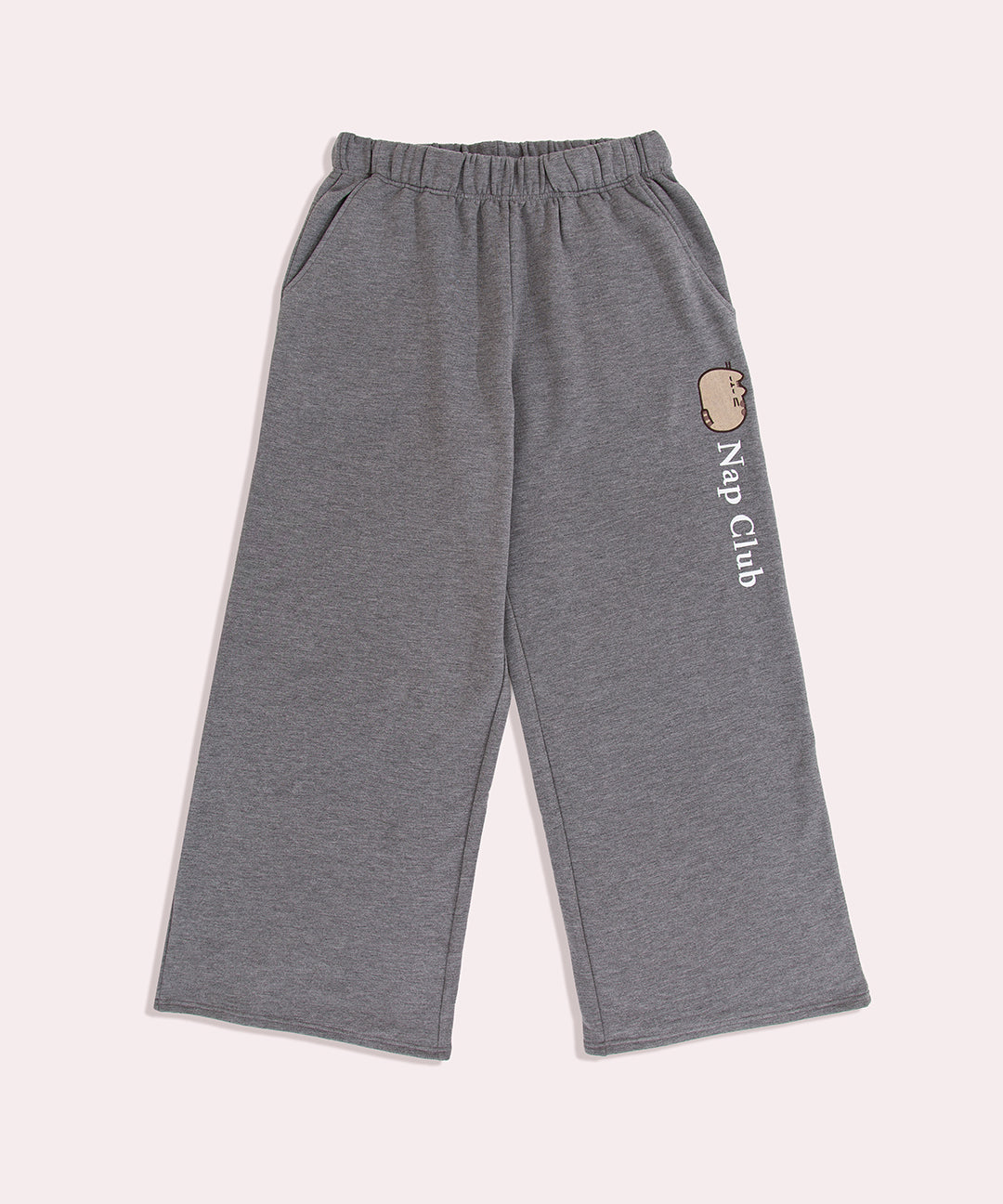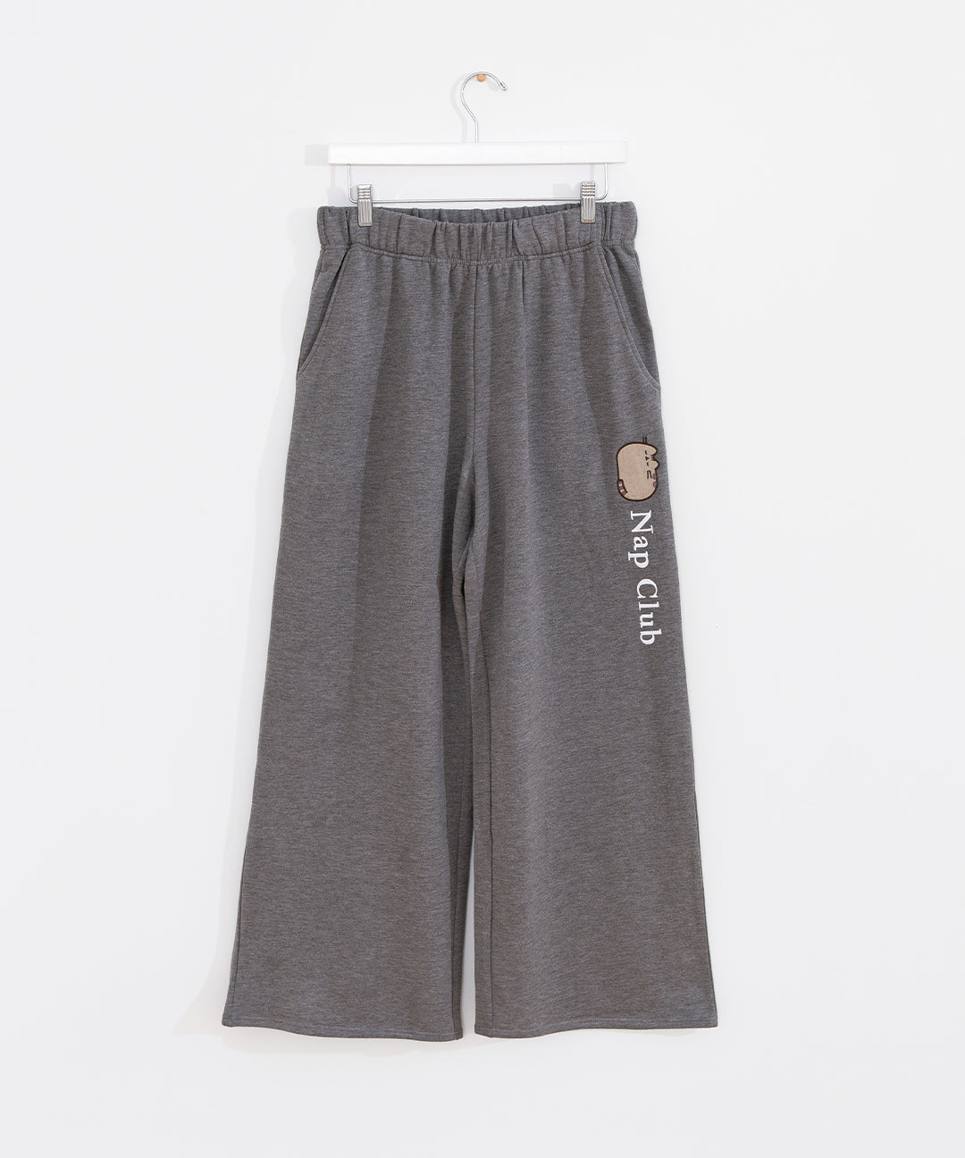 - Wide-leg loungewear pant includes elastic waistband, front slant side pockets plus the embroidered phrase "Nap Club" with Pusheen incorporating soft flocking down wearer's left leg.